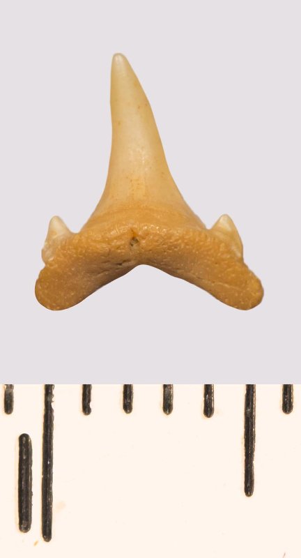Зуб. Акула. Scapanorhynchus rhaphiodon Agassiz, 1843. Классификация: Хордовые Chordata, Позвоночные Vertebrata, Хрящевые рыбы Chondrichthyes, Пластиножаберные Elasmobranchii