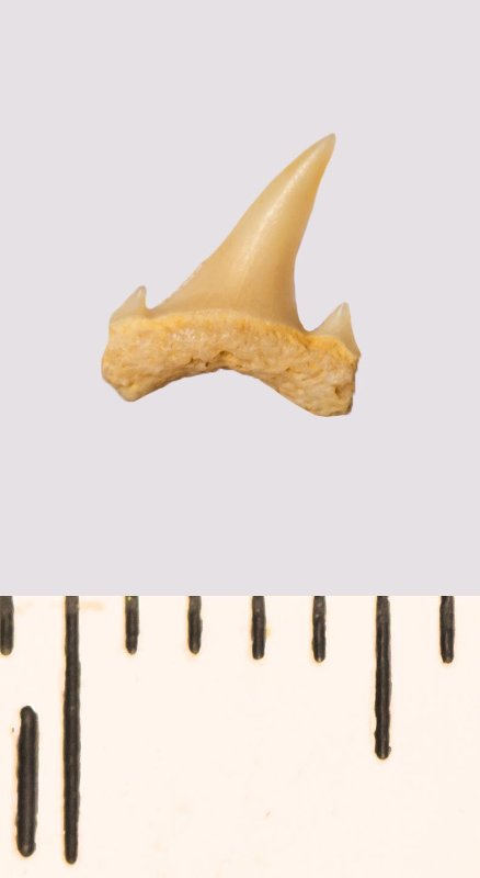 Зуб. Акула. Scapanorhynchus rhaphiodon Agassiz, 1843. Классификация: Хордовые Chordata, Позвоночные Vertebrata, Хрящевые рыбы Chondrichthyes, Пластиножаберные Elasmobranchii