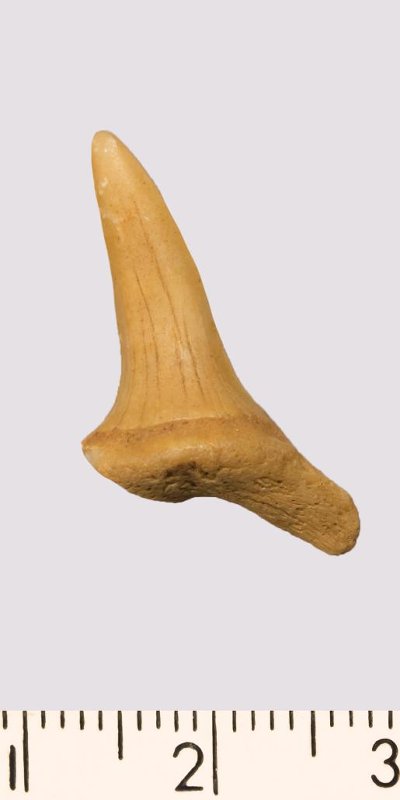 Зуб. Акула. Scapanorhynchus gigas Woodward, 1889. Классификация: Хордовые Chordata, Позвоночные Vertebrata, Хрящевые рыбы Chondrichthyes, Пластиножаберные Elasmobranchii