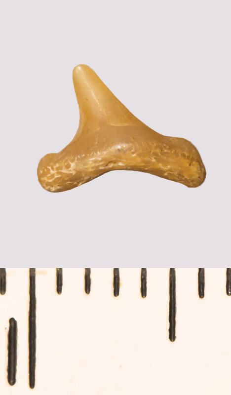 Зуб. Акула. Scapanorhynchus rhaphiodon Agassiz, 1843. Классификация: Хордовые Chordata, Позвоночные Vertebrata, Хрящевые рыбы Chondrichthyes, Пластиножаберные Elasmobranchii