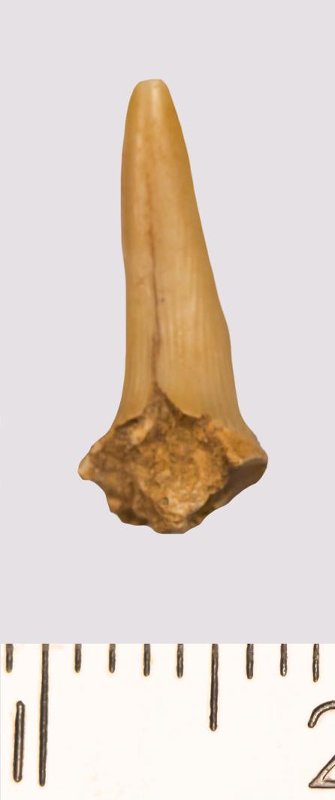 Зуб (фрагмент). Акула. Rhaphiodus sp. Классификация: Хордовые Chordata, Позвоночные Vertebrata, Хрящевые рыбы Chondrichthyes, Пластиножаберные Elasmobranchii