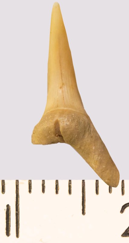 Зуб. Акула. Scapanorhynchus rhaphiodon Agassiz, 1843. Классификация: Хордовые Chordata, Позвоночные Vertebrata, Хрящевые рыбы Chondrichthyes, Пластиножаберные Elasmobranchii