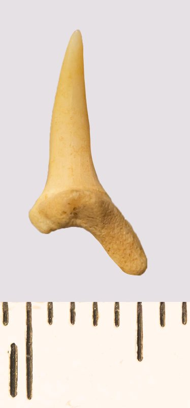 Зуб. Акула. Scapanorhynchus rhaphiodon Agassiz, 1843. Классификация: Хордовые Chordata, Позвоночные Vertebrata, Хрящевые рыбы Chondrichthyes, Пластиножаберные Elasmobranchii