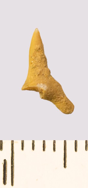 Зуб. Акула. Scapanorhynchus rhaphiodon Agassiz, 1843. Классификация: Хордовые Chordata, Позвоночные Vertebrata, Хрящевые рыбы Chondrichthyes, Пластиножаберные Elasmobranchii