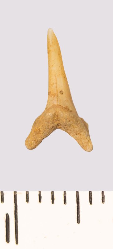 Зуб. Акула. Scapanorhynchus rhaphiodon Agassiz, 1843. Классификация: Хордовые Chordata, Позвоночные Vertebrata, Хрящевые рыбы Chondrichthyes, Пластиножаберные Elasmobranchii