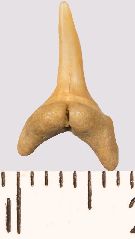 Зуб. Акула. Scapanorhynchus rhaphiodon Agassiz, 1843. Классификация: Хордовые Chordata, Позвоночные Vertebrata, Хрящевые рыбы Chondrichthyes, Пластиножаберные Elasmobranchii