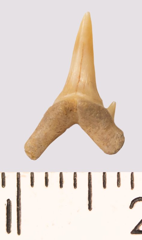 Зуб. Акула. Scapanorhynchus rhaphiodon Agassiz, 1843. Классификация: Хордовые Chordata, Позвоночные Vertebrata, Хрящевые рыбы Chondrichthyes, Пластиножаберные Elasmobranchii