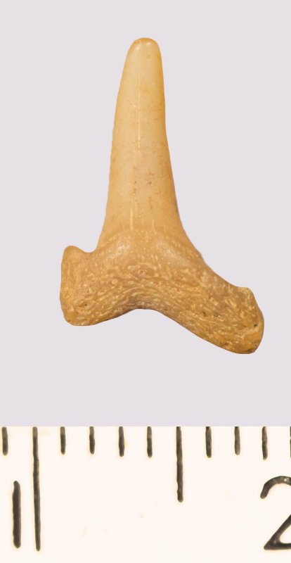 Зуб. Акула. Scapanorhynchus rhaphiodon Agassiz, 1843. Классификация: Хордовые Chordata, Позвоночные Vertebrata, Хрящевые рыбы Chondrichthyes, Пластиножаберные Elasmobranchii