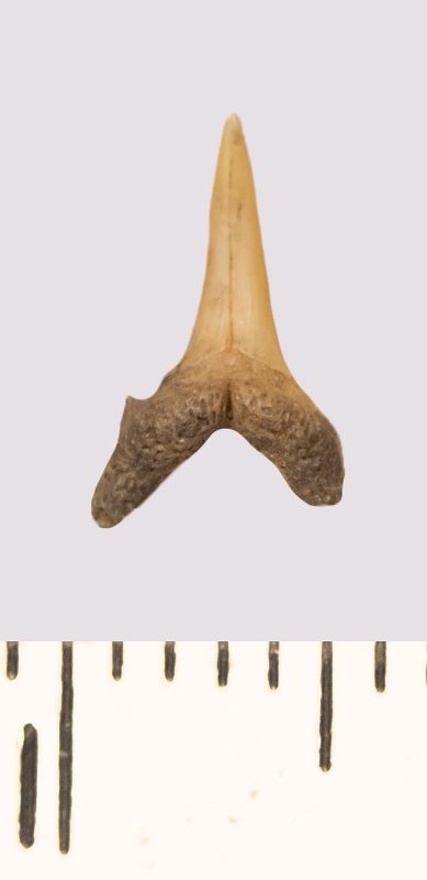 Зуб. Акула. Scapanorhynchus rhaphiodon Agassiz, 1843. Классификация: Хордовые Chordata, Позвоночные Vertebrata, Хрящевые рыбы Chondrichthyes, Пластиножаберные Elasmobranchii