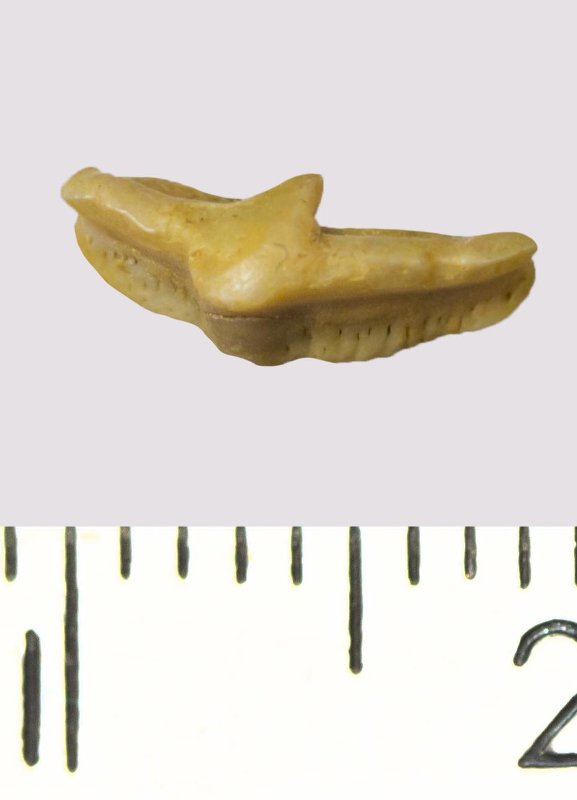 Зуб. Акула. Squatina sp. Классификация: Хордовые Chordata, Позвоночные Vertebrata, Хрящевые рыбы Chondrichthyes, Пластиножаберные Elasmobranchii