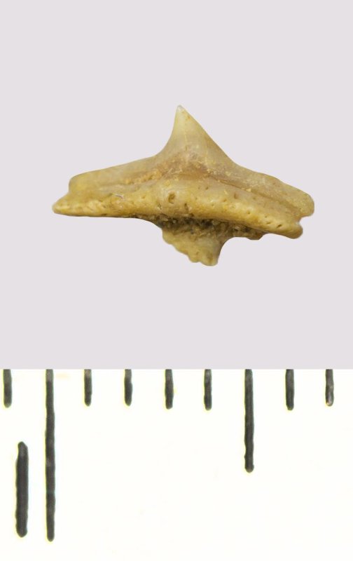 Зуб. Акула. Squatina sp. Классификация: Хордовые Chordata, Позвоночные Vertebrata, Хрящевые рыбы Chondrichthyes, Пластиножаберные Elasmobranchii