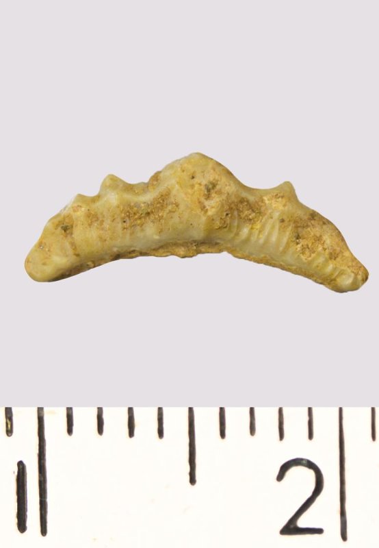 Зуб (фрагмент). Акула. Polyacrodus sp. Классификация: Хордовые Chordata, Позвоночные Vertebrata, Хрящевые рыбы Chondrichthyes, Пластиножаберные Elasmobranchii