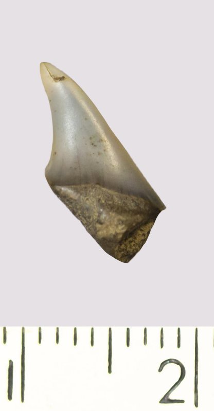 Зуб (фрагмент). Акула. Odontaspis venusta (Leriche, 1929). Классификация: Хордовые Chordata, Позвоночные Vertebrata, Хрящевые рыбы Chondrichthyes, Пластиножаберные Elasmobranchii