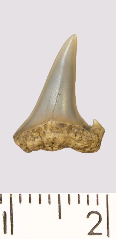 Зуб (фрагмент). Акула. Odontaspis venusta (Leriche, 1929). Классификация: Хордовые Chordata, Позвоночные Vertebrata, Хрящевые рыбы Chondrichthyes, Пластиножаберные Elasmobranchii