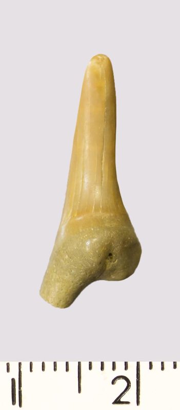 Зуб (фрагмент). Акула. Scapanorhynchus gigas Woodward, 1889. Классификация: Хордовые Chordata, Позвоночные Vertebrata, Хрящевые рыбы Chondrichthyes, Пластиножаберные Elasmobranchii