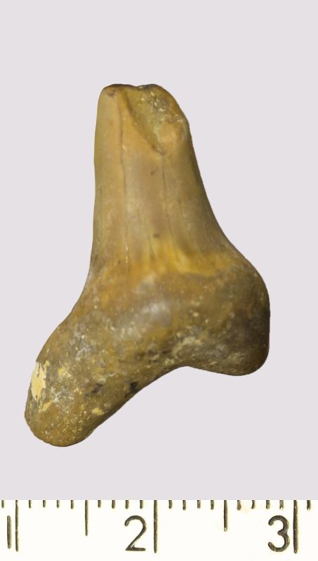 Зуб. Акула. Scapanorhynchus gigas Woodward, 1889. Классификация: Хордовые Chordata, Позвоночные Vertebrata, Хрящевые рыбы Chondrichthyes, Пластиножаберные Elasmobranchii