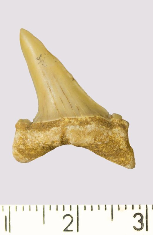 Зуб. Акула. Scapanorhynchus gigas Woodward, 1889. Классификация: Хордовые Chordata, Позвоночные Vertebrata, Хрящевые рыбы Chondrichthyes, Пластиножаберные Elasmobranchii