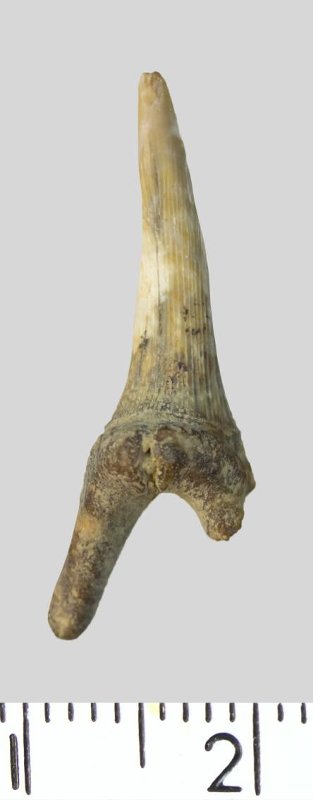 Зуб. Акула. Scapanorhynchus sp. Классификация: Хордовые Chordata, Позвоночные Vertebrata, Хрящевые рыбы Chondrichthyes, Пластиножаберные Elasmobranchii