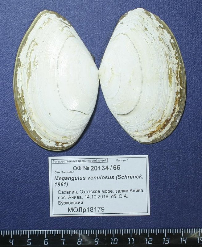 морской двустворчатый моллюск. Megangulus venulosus (Schrenck, 1861), Tellinidae. Классификация: Моллюски Mollusca, Двустворчатые моллюски Bivalvia