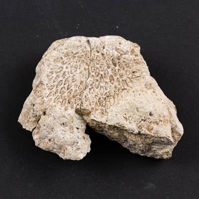 Сетчатая колония мшанки на субстрате. Субстрат представлен плотным кристаллическим известняком молочно-белого цвета.