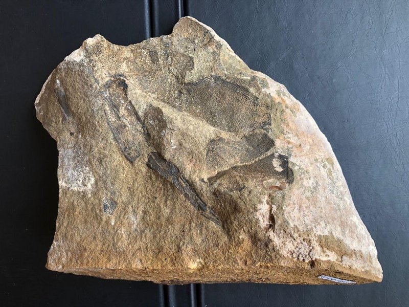 Часть брюшного панциря и плавник на субстрате. Пластинокожие (панцирные) рыбы. Remigolepis suusamyrensis Panteleyev, 1992. Классификация: Хордовые Chordata, Позвоночные Vertebrata, Пластинокожие рыбы Placodermi, Антиархи Antiarchi, Asterolepiformes, Пластинокожие (панцирные) рыбы Remigolepis suusamyrensis Panteleyev, 1992