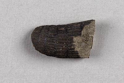 Окаменевший фрагмент стебля. Сужается к нижнему краю. Отчетливо различимы узлы и междоузлия, ребра четко выражены.
