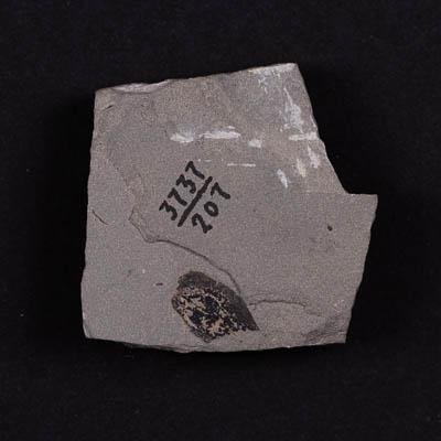 Отпечаток семени хвойного на породе. Порода представлена плотным алевролитом серого цвета.