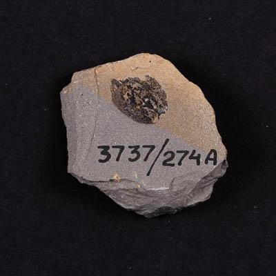 Отпечаток семени хвойного на породе. Порода представлена плотным алевролитом бежевого и серого цвета.