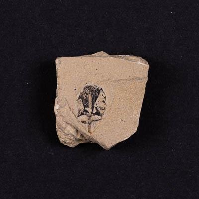 Отпечаток семени хвойного на породе. Порода представлена плотным алевролитом бежевого и серого цвета.