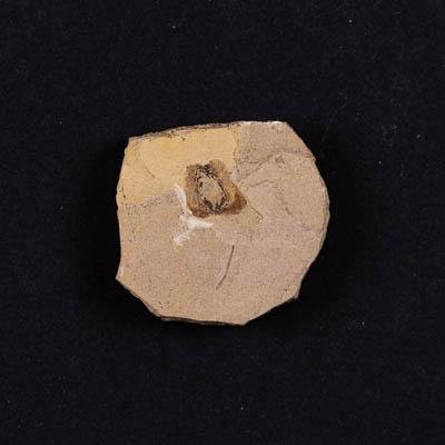 Отпечаток семени хвойного на породе. Порода представлена плотным алевролитом бежевого и серого цвета.