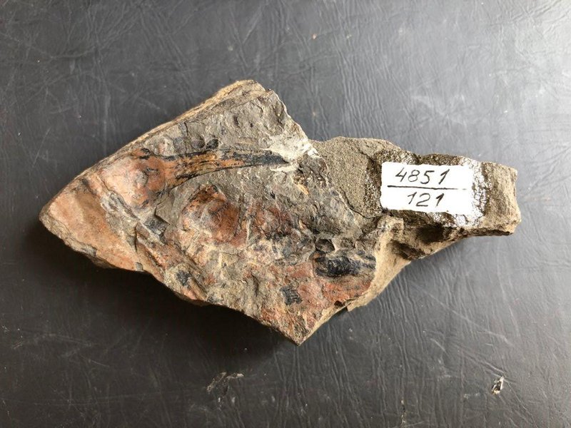 На породе отпечаток спорофилла. Порода представлена темно-серым алевролитом.