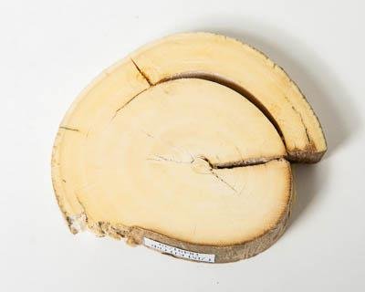 Двусторонний поперечный срез (спил) бивня мамонта, округлый в сечении, молочно-желтого цвета. Частично сохранилась внешняя поверхность бивня, окраска от бежевой до молочно-белой. Бивень рассохся. Обе поверхности спила полированы. На спилах четко различимы линии Шрегера.