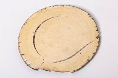 Двусторонний поперечный срез (спил) бивня мамонта, округлый в сечении, молочно-белого цвета. Частично сохранилась внешняя поверхность бивня, окраска красновато-коричневая. Бивень рассохся, трещины крупные концентрические. Обе поверхности спила полированы. На одной поверхности спила четко различимы линии Шрегера.