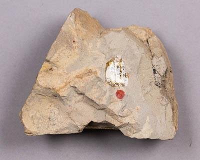 Уплощенная семеносная пластинка, яйцевидной формы. Отчетливо видны семенные рубчики. Частично вдоль края сохранилась фитолейма, придающая отпечатку черный цвет. Порода представлена аргиллитом кремового цвета.
