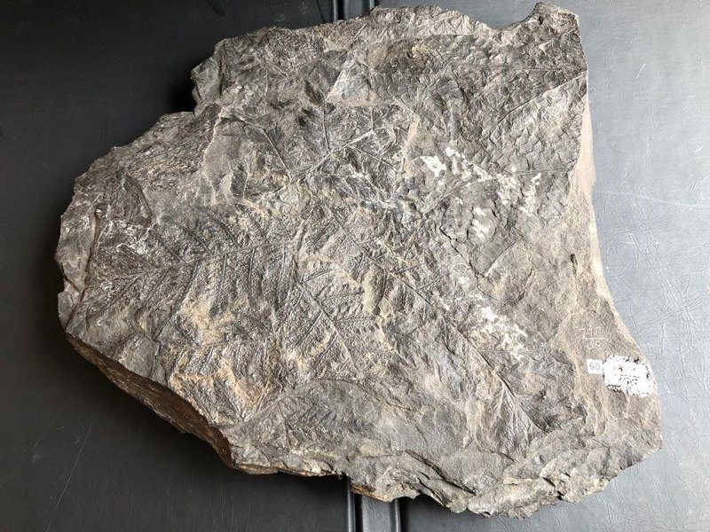 Многочисленные отпечатки вайи папоротников на породе. Порода представляет собой углефицированный сланец.