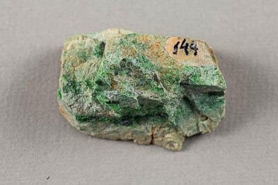 Образец неправильной формы, массивный, скрытокристаллический, окраска идет слоями - от яблочно-зеленых слоев до белых, коричневый на выветрелых поверхностях, блеск матовый.