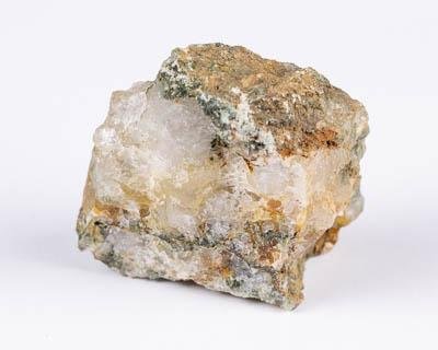 Образец неправильной формы. Состоит из кварца двух типов - прозрачного, бесцветного (горный хрусталь) и луково-зеленого, непрозрачного (празем). Блеск стеклянный. Твердость 7. Излом неровный.