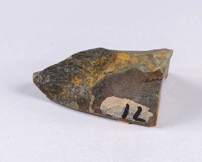 Образец неправильной формы, с острыми гранями. Плотный массивный. Непрозрачный, окраска узорчатая, цвет от темно серого до белого. Блеск матовый, стеклянный на полированной поверхности. Твердость 7.