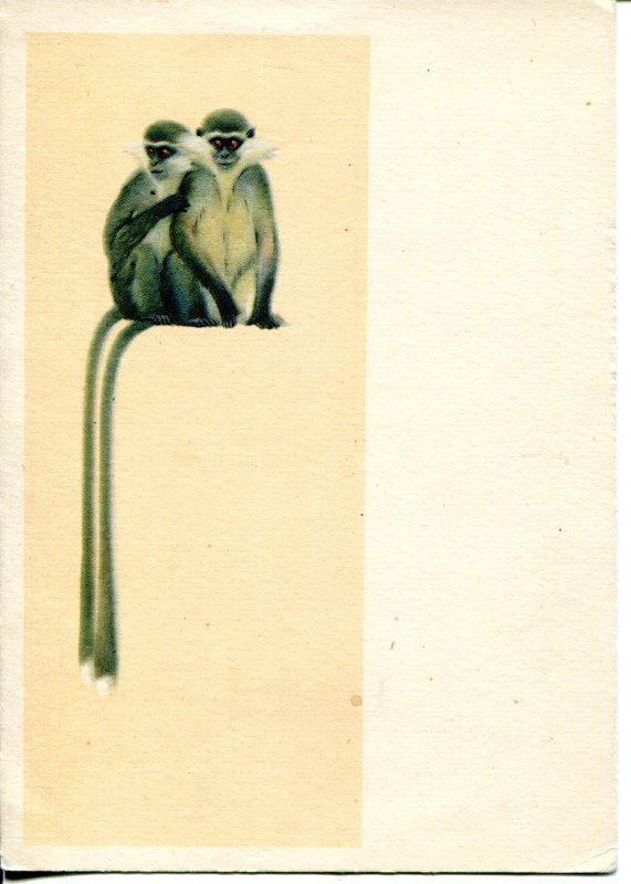 Открытка прямоугольного формата с изображением двух сидящих зеленых мартышек по рисунку В.В. Трофимова. Оно занимает правую часть листа.