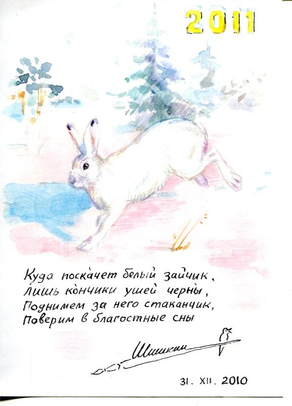 Открытка прямоугольного формата с изображением белого зайца на фоне лесного пейзажа с елочкой, над ним надпись: 2011.