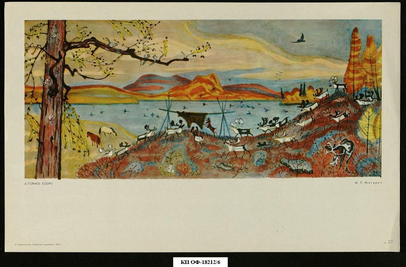 На листе горизонтального формата изображен пейзаж с горами на дальнем плане, озером на среднем плане холмистым берегом на первом плане. На первом плане справа высокое дерево, по его стволу и веткам бегают бурундуки, правее пасутся две лошади. В центре растянута на жердях шкура медведя, вокруг неё ходят олени.