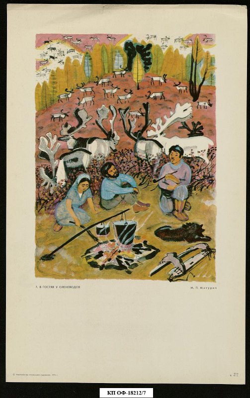 На листе вертикального формата изображен пейзаж с пасущимися оленями. На первом плане - костёр и котелки над огнём. У костра сидят двое оленеводов (женщина и мужчина), между ними Геннадий Снегирев, справа - собака.