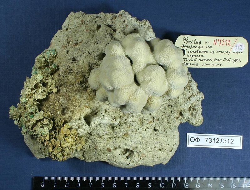 коралл поритес + водоросль на основании отмершего коралла. Porites sp., Poritidae. Классификация: Стрекающие Cnidaria, Коралловые полипы Anthozoa, Коралл, Poritidae, Коралл поритес Porites sp.