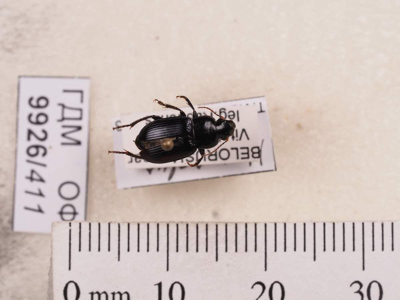 Сухое насекомое. Жук птеростих. Harpalus. Классификация: Членистоногие Arthropoda, Насекомые Insecta, Жуки Coleoptera, Жужелицы Carabidae, Carabus, Жук C. coriaceus Linne, 1758