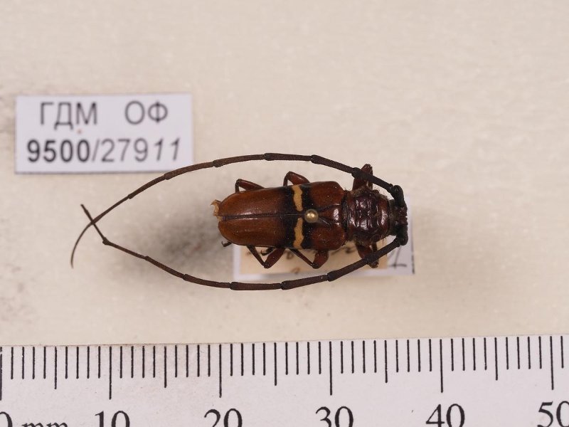 Сухое насекомое. Жук усач. Trachyderes politus Bates, 1870. Классификация: Членистоногие Arthropoda, Насекомые Insecta, Жуки Coleoptera, Усачи Cerambycidae
