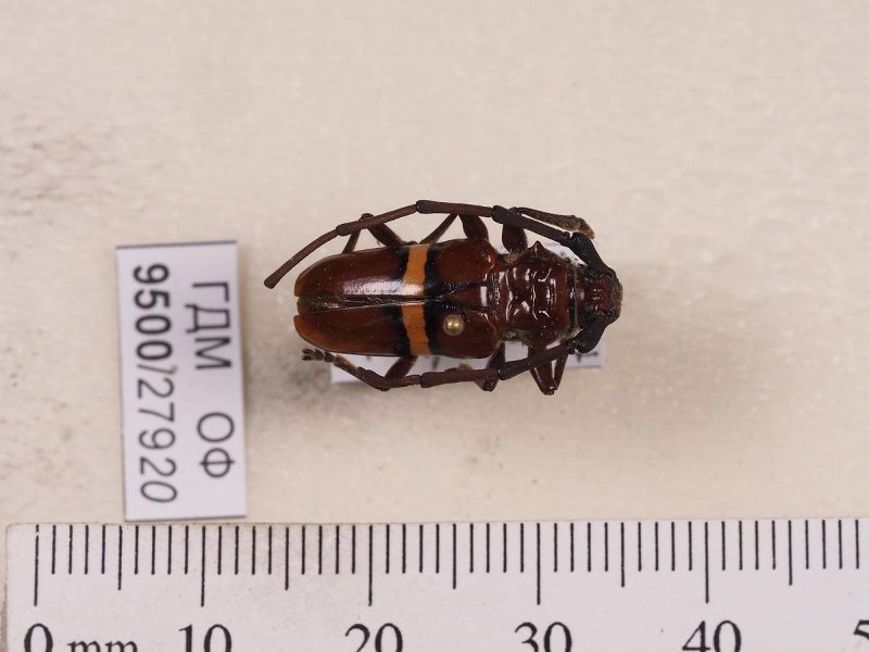 Сухое насекомое. Жук усач. Trachyderes politus Bates, 1870. Классификация: Членистоногие Arthropoda, Насекомые Insecta, Жуки Coleoptera, Усачи Cerambycidae