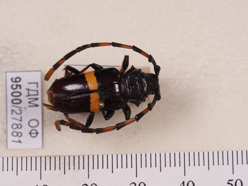 Сухое насекомое. Жук усач. Trachyderes distinctus Bosq, 1951. Классификация: Членистоногие Arthropoda, Насекомые Insecta, Жуки Coleoptera, Усачи Cerambycidae