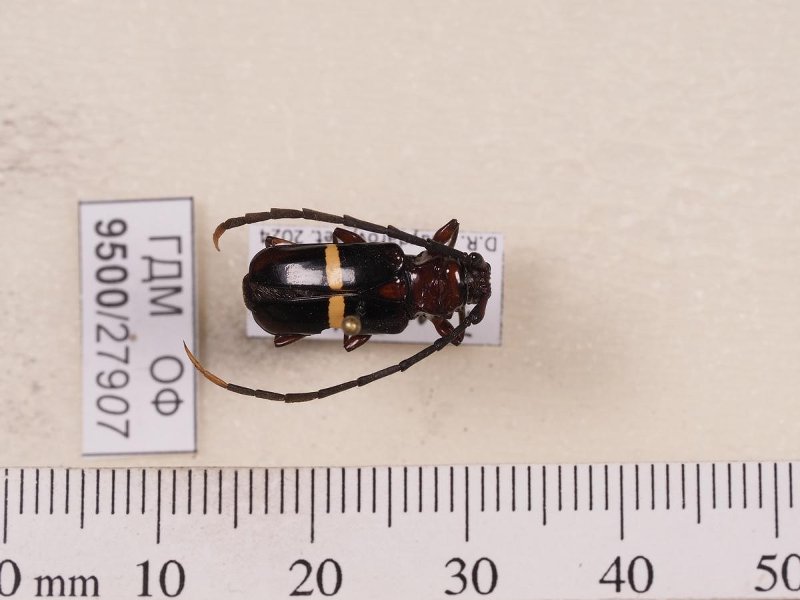 Сухое насекомое. Жук усач. Trachyderes politus Bates, 1870. Классификация: Членистоногие Arthropoda, Насекомые Insecta, Жуки Coleoptera, Усачи Cerambycidae