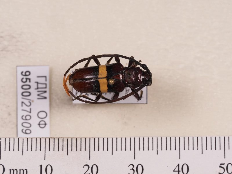 Сухое насекомое. Жук усач. Trachyderes politus Bates, 1870. Классификация: Членистоногие Arthropoda, Насекомые Insecta, Жуки Coleoptera, Усачи Cerambycidae