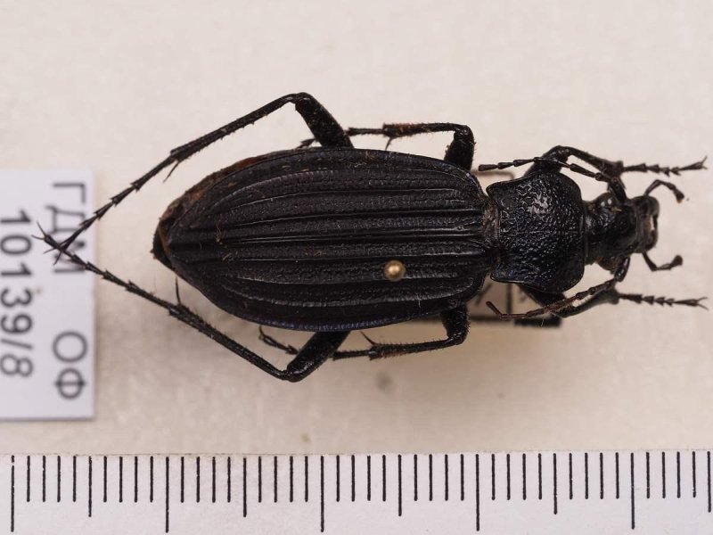 Сухое насекомое. Жук жужелица. Carabus septemcarinatus Motschulsky, 1840. Классификация: Членистоногие Arthropoda, Насекомые Insecta, Жуки Coleoptera, Жужелицы Carabidae